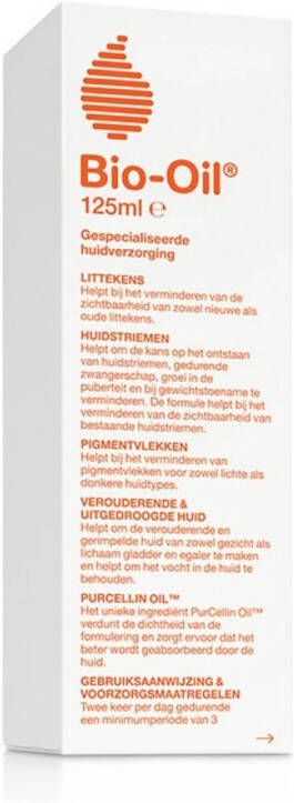Bio-Oil® is een gespecialiseerd huidverzorgingsproduct dat bijdraagt tot het verzachten van littekens, huidstriemen en pigmentvlekken. Deze geavanceerde formule, die het unieke ingrediënt PurCellin Oil™ bevat, is ook uitermate geschikt voor iedere andere huid,.