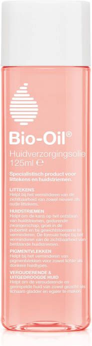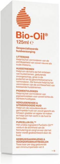 Bio‑Oil is een gespecialiseerd huidverzorgingsproduct dat helpt bij het verminderen van de zichtbaarheid van littekens, huidstriemen en pigmentvlekken. Het product is ook uitermate geschikt voor de verouderende en uitgedroogde huid. • Wereldwijd hét toonaangevende product op het gebied van littekens en huidstriemen.• Ook uitermate geschikt voor de vermindering van de zichtbaarheid van pigmentvlekken en voor de verouderende en uitgedroogde huid.• Bevat het unieke ingrediënt PurCellin OilTM. • Niet vette formule, trekt snel in de huid.• Hypoallergeen en niet-comedogeen.• Geschikt voor de gevoelige huid.