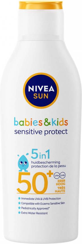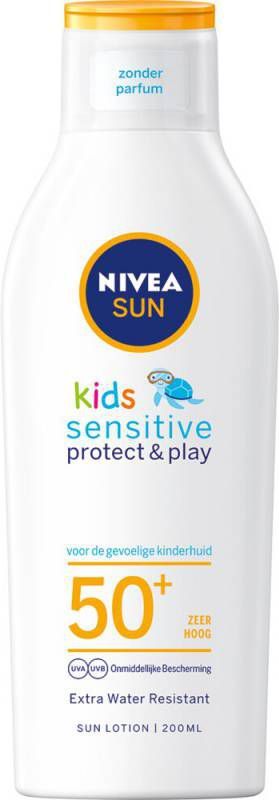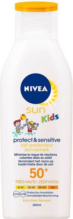 NIVEA SUN Kids Protect & Sensitive Lotion SPF50+ 200 ml speciaal ontwikkeld voor de gevoelige huid, omdat deze vrij van parfum, kleurstoffen en conserveringsmiddelen is. Daarnaast zorgt deze zonnelotion voor een betrouwbare bescherming en langdurige hydratatie met het effectieve UVA/UVB- filtersysteem.Gebruikswijze- Schudden voor gebruik. Royaal aanbrengen voor het zonnen en regelmatig opnieuw aanbrengen, vooral na het zwemmen, afdrogen of zweten om de juiste bescherming te behouden.- Onvoldoende zonbescherming gebruiken vermindert de beschermingsfactor aanzienlijk. Blijf niet te lang in de zon, ook al gebruik je een zonbescherming. Overmatig blootstelling aan de zon is een ernstig gezondheidsrisico. Houd baby's en jonge kinderen uit de zon. Vermijd direct contact met textiel en harde oppervlakten om vlekken te voorkomen. Huidvriendelijkheid dermatologisch goedgekeurd onder pediatrische controle.